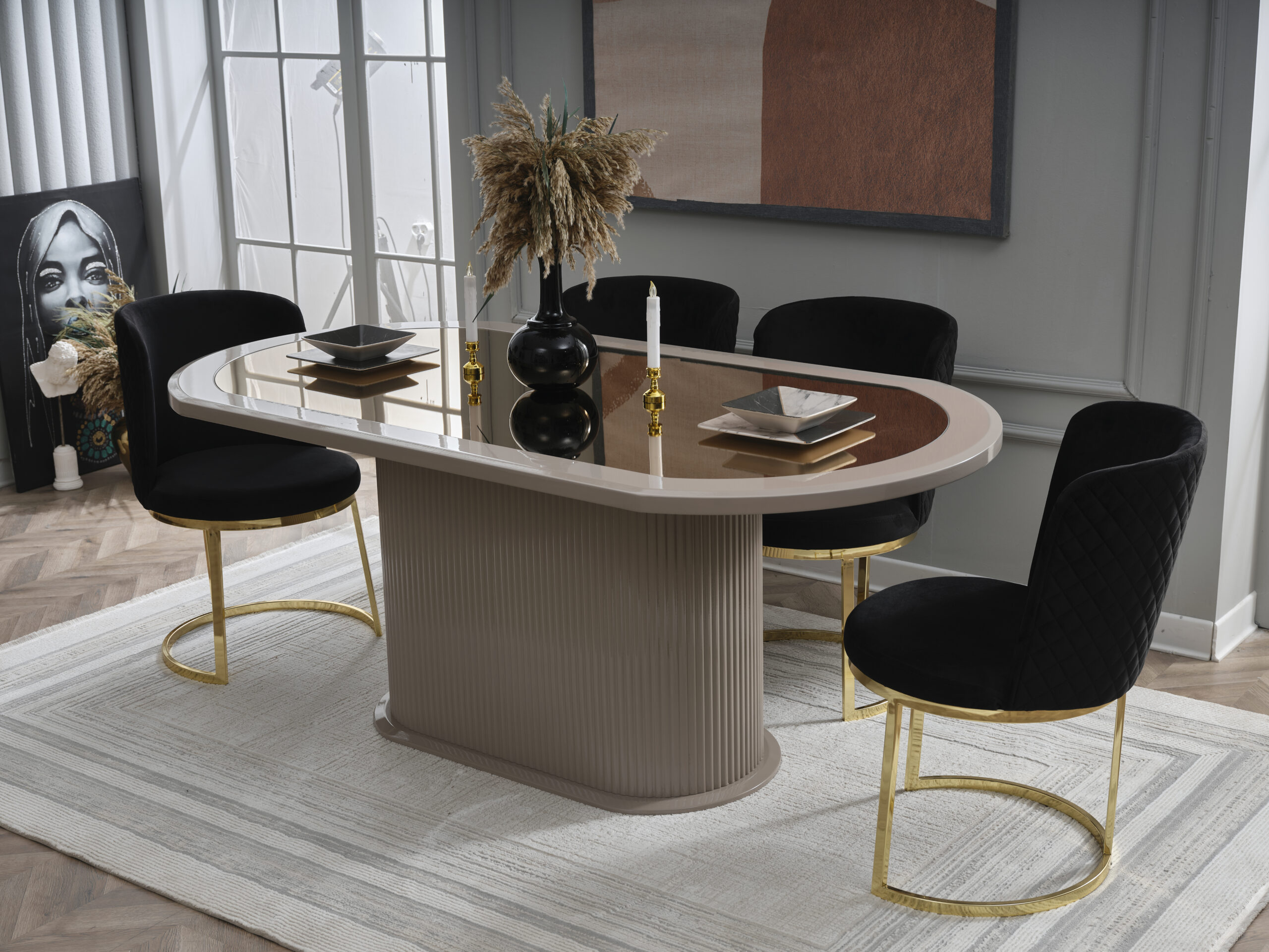 Das esstisch kommt mit eine schönes Holz in einem unverwechselbaren Cappuccino-Ton mit goldenen Details und Großer Essplatz mit eleganter Optik und markanter Glasfront 190x100x78 cm - Lieferung in ca. 6-10 Wochen.